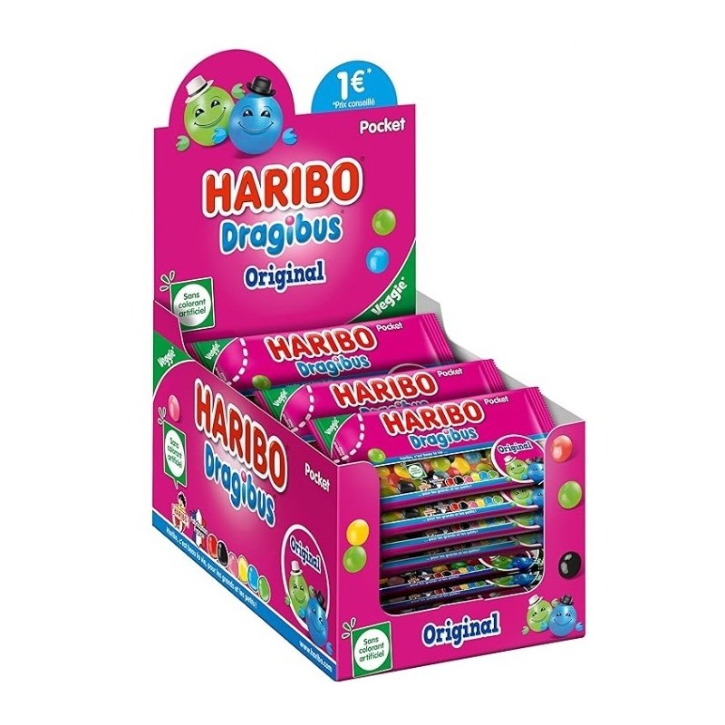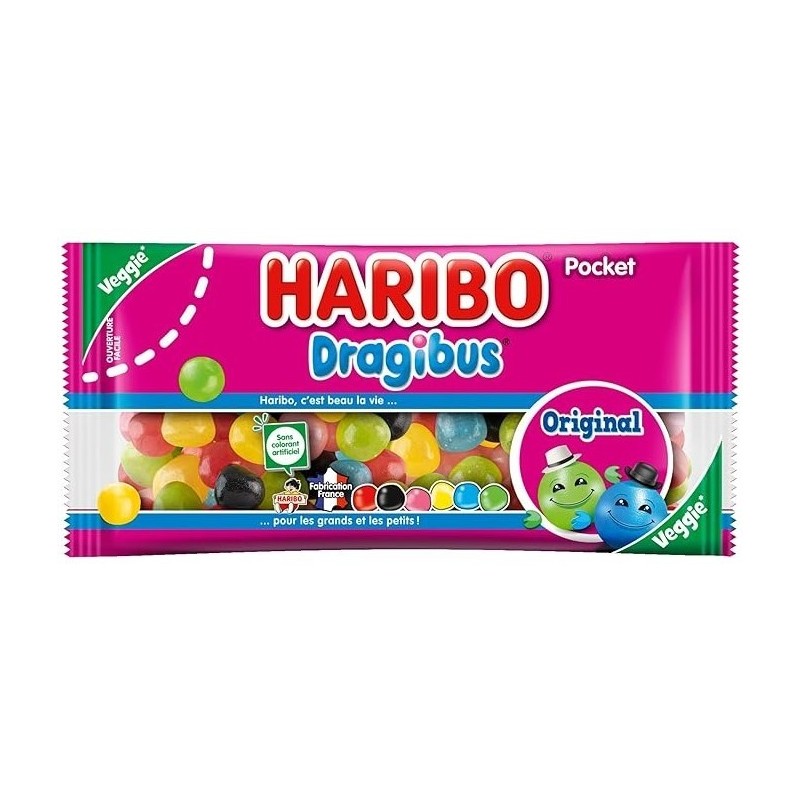 Caratteristiche: I Dragibus sono caramelle a forma di pallina, con un guscio croccante all’esterno e un cuore morbido all’interno. Sono molto colorate e divertenti! Puoi trovarli nei colori classici: rosso, nero, rosa, giallo, blu e verde. Non contengono gelatina né coloranti artificiali.